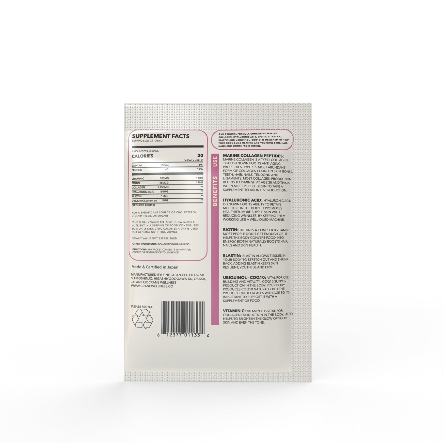 Marine collagen peptides powder, hyaluronic acid, biotin, vitamin C, coix seed extract, and more. Ideal for anti-aging, reducing wrinkles and fine lines, hydrating your skin, and support joints, hair and nails.